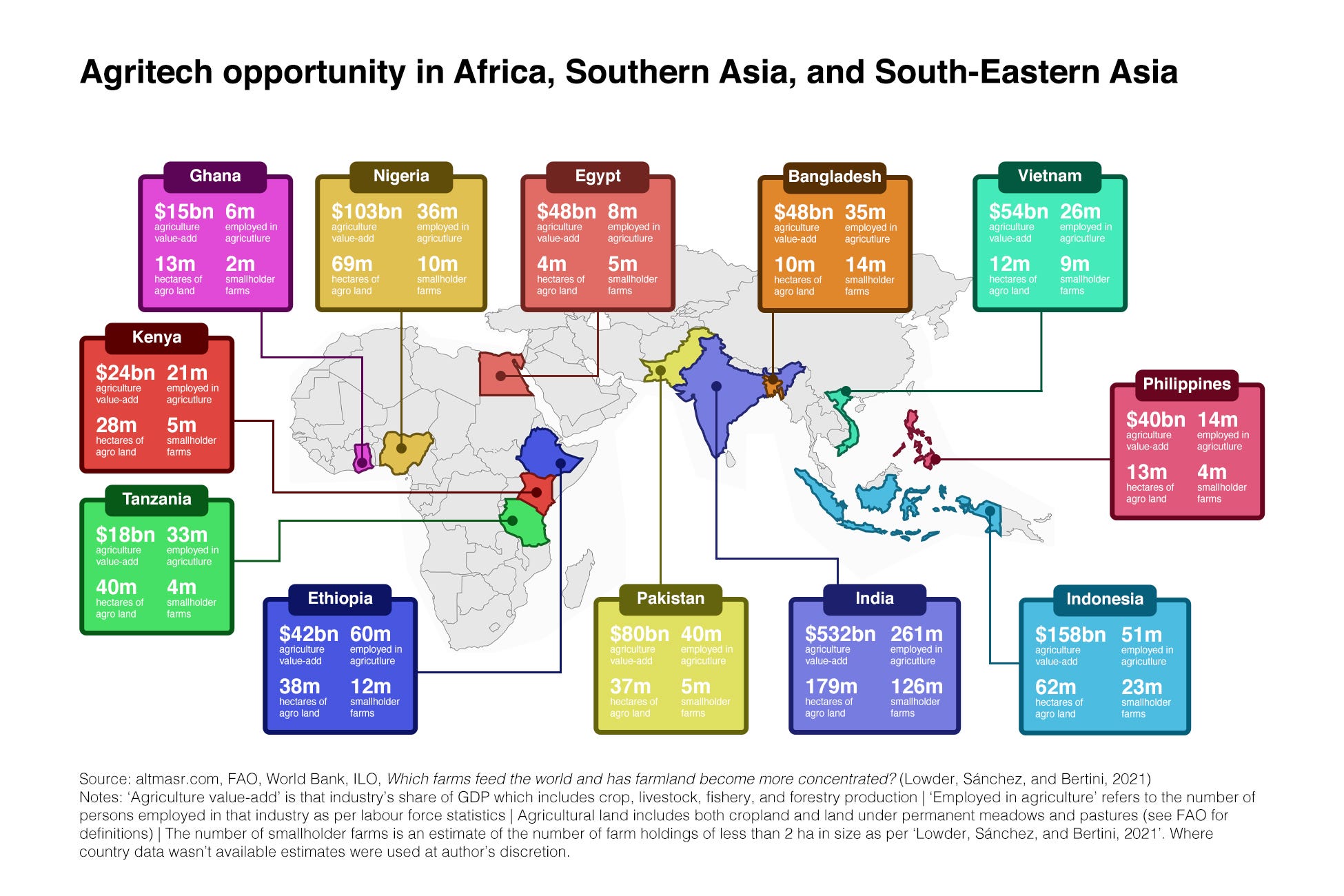 There are 3 regions that stand out for having large numbers of smallholder farms contributing a sizeable share of food output and with ample potential for tech disruption. Those are Africa, Southern Asia, and South-Eastern Asia.